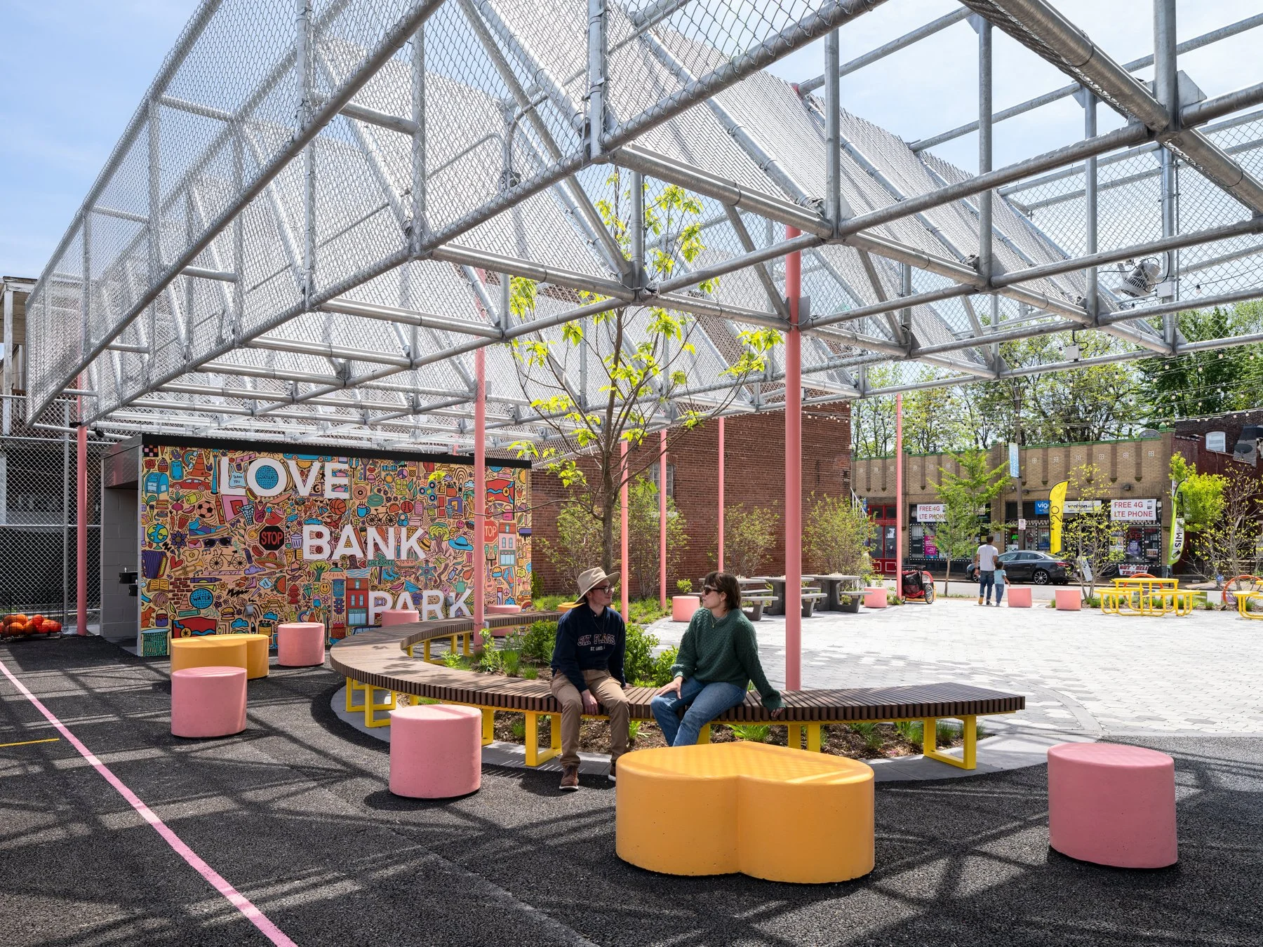 Love Bank Park boasts an array of features and enhancements aimed at enriching the visitor experience and promoting community engagement. The basketball court is the focal point for recreational activities. With water-permeable pavement, the court is a sustainable playing surface that is already well-used by local residents. The inclusion of an open plaza area equipped with a central seating area with a shade pavilion, additional seating areas, chess tables, and shade trees provides a versatile venue for cultural events, performances, and social gatherings. The park is designed to host a variety of community events, from movie nights and farmers' markets to neighborhood festivals and cultural celebrations. The park's integration of sustainable design elements such as permeable pavers, as well as rain gardens, underscores a commitment to environmental stewardship, serving as a model for urban sustainability.