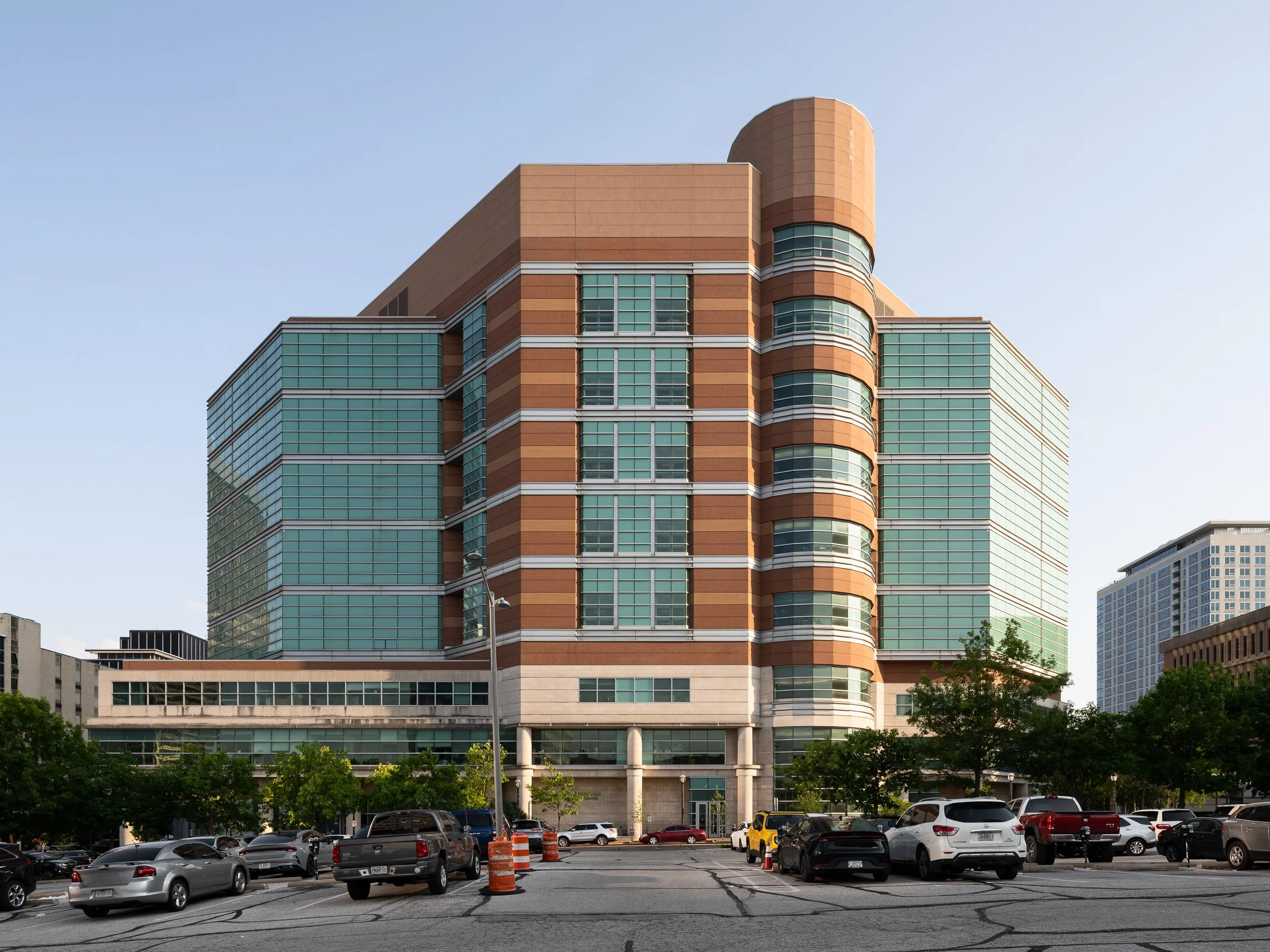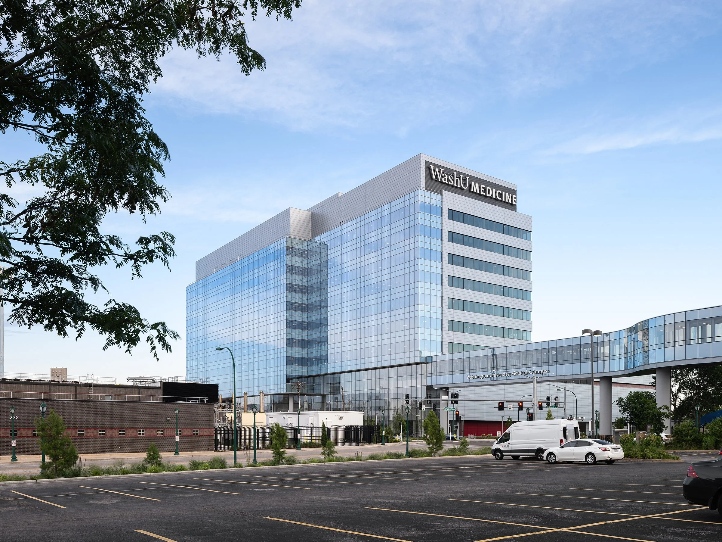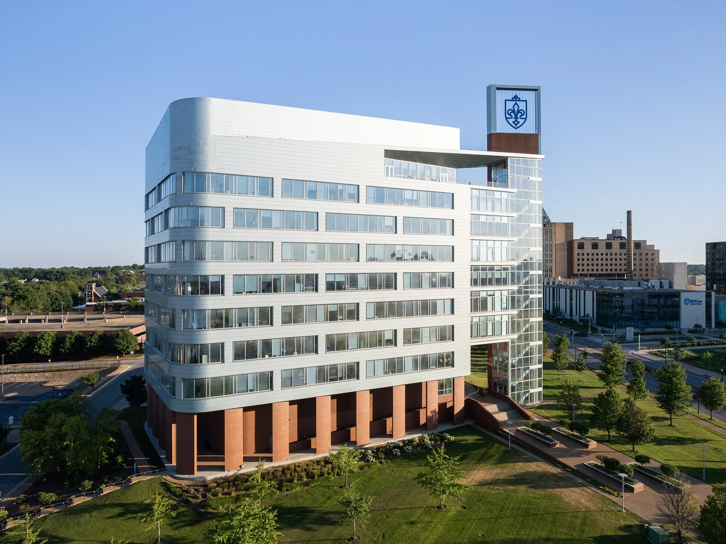 Named after Edward A. Doisy, Nobel Prize-winning biochemist and former Saint Louis University professor, this facility houses the university’s medical research programs in neuroscience, immunology, and cardiovascular studies. With a distinctive teardrop-shaped footprint, the base level and entry arcade is executed in red brick, while metal panels and ribbon windows comprise the rest of the tower. The illuminated fleur-de-lis beacon crowning the glazed staircase section creates a clear visual link to the main campus located across the highway, symbolically unifying the university's academic and medical missions. Within the 10-story building, modular laboratory spaces are arranged in open configurations. High-security areas accommodate infectious disease research on HIV and tuberculosis alongside cancer and vaccine development labs.