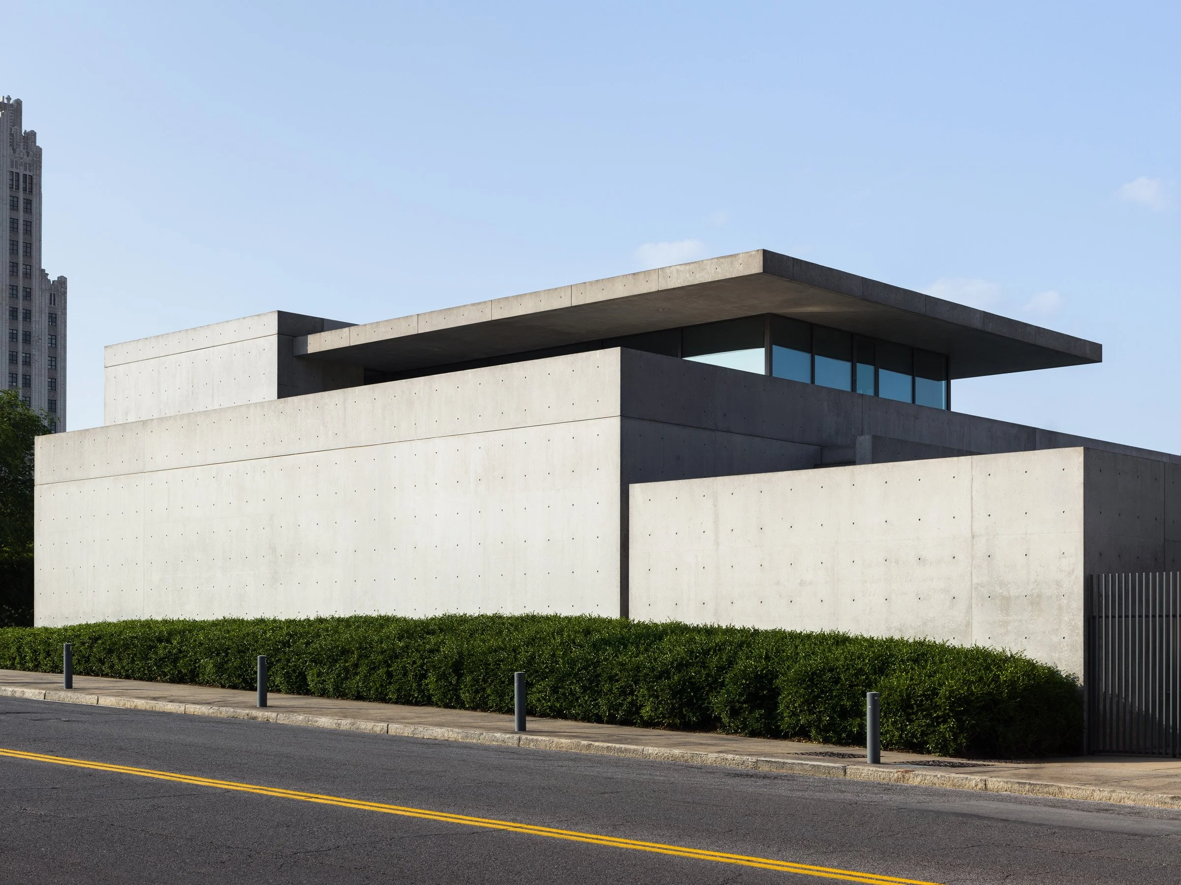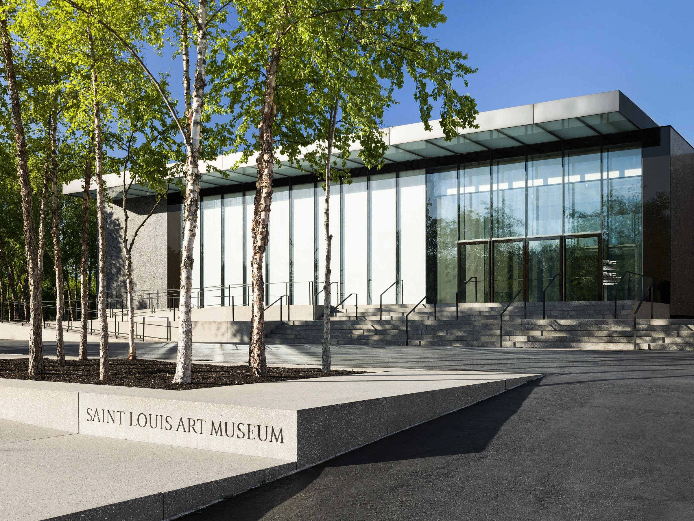 The East Building expansion of the Saint Louis Art Museum is a contemporary counterpoint to Cass Gilbert's 1904 building that respects the historic structure's prominence in Forest Park. A single-story pavilion sitting on a low plinth, the building is clad with panels of dark polished concrete containing Missouri and Wisconsin river aggregates, creating a material contrast against Gilbert's light stone. Inside, a coffered ceiling grid holds skylights that provide filtered light while the exposed concrete stabilizes gallery temperatures. This ceiling system, paired with automated shades on floor-to-ceiling windows, helped the project achieve LEED Gold certification while maintaining strict conservation standards. The modular design also allows for the flexible reconfiguration of exhibition walls. Behind the building, a garden displays some highlights of the museum’s collection of modern and contemporary sculpture.
