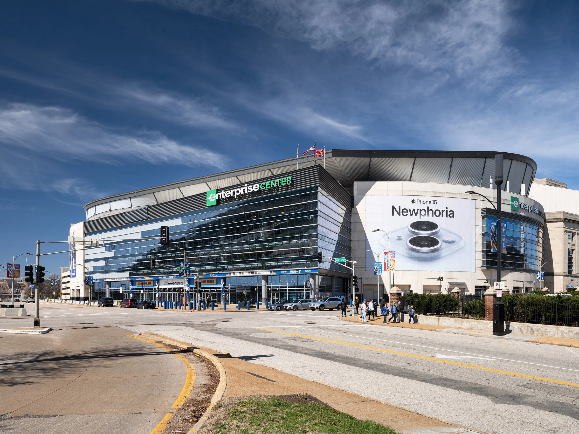Replacing the old Arena as a new downtown home for the Blues, the Enterprise Center was built on the site of the demolished Kiel Auditorium, part of a block-wide transformation that preserved the adjacent Kiel Opera House. Project designer Thom Greving conceptualized the arena as a "building in motion," intended to evoke the speed and grace of hockey. This is most evident in its massive, asymmetrical convex roof – a curving, floating plane that is creased along a ridge and inclined upward, and which appears to spin from the arena bowl. While the client requested a contemporary appearance, the design does acknowledge its context. Salvaged panels and a cast-iron awning from the old auditorium create a physical transition to the adjoining classical opera house.