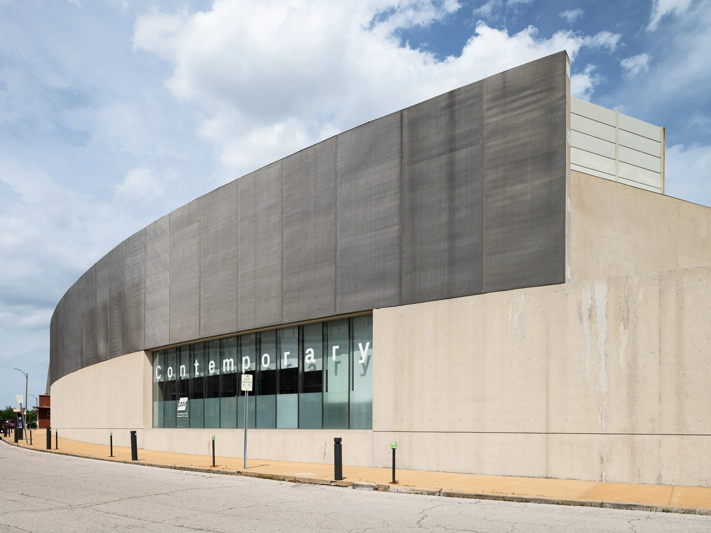 The Contemporary Art Museum St. Louis is a purpose-built facility for rotating exhibitions that replaced the cramped multi-story Forum for Contemporary Art in 2003. Brad Cloepfil's first major museum commission favors structural clarity and intelligent use of basic materials over architectural spectacle. Interlocking concrete planes combined with stainless steel mesh panels wrap the curved corner like a jacket, creating textural variation while conforming to the street's curved shape. The boldest gesture is a 70-foot concrete cantilever where an upper concrete wall rests on a mere 10-inch-wide lower wall, demonstrating remarkable engineering precision within a limited budget. The interior contains three interconnected galleries with varying ceiling heights, illuminated by skylights, and connects to a courtyard shared with the adjacent Pulitzer Foundation.
