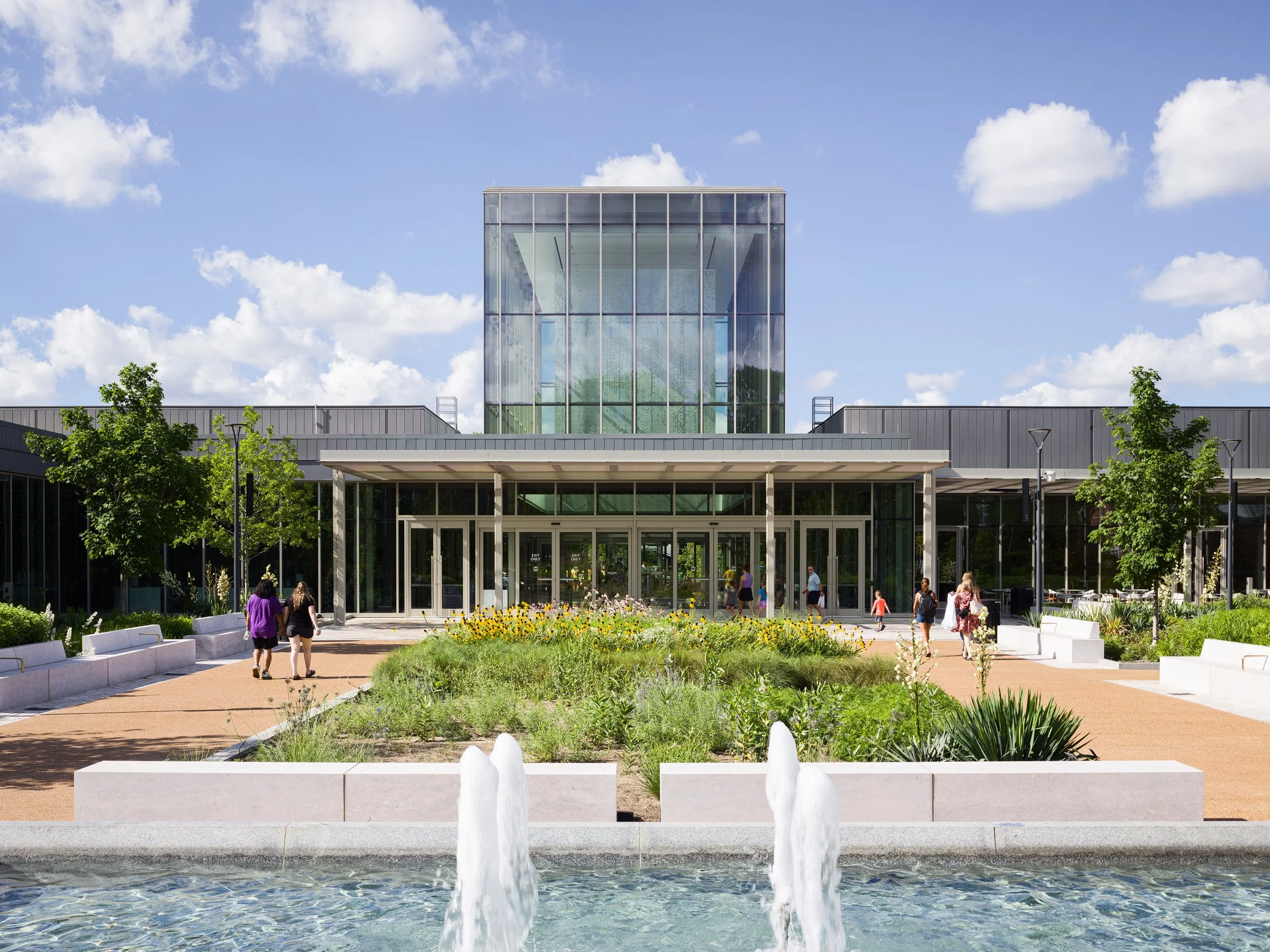 A portal between the city and the manicured world of the botanical garden, the Jack C. Taylor Visitors Center replaced a 1982 facility that did not meet modern accessibility standards. Ayers Saint Gross resolved this issue by elevating the entry with gently sloped paths and terraces. The building is a low, solid base of Missouri limestone and zinc, supporting a multi story glass and steel pavilion resembling a lantern. Inside this entry space, a suspended scrim filters daylight through a pattern inspired by Ginkgo leaves. This creates a dappled effect evoking a woodland clearing, immersing guests in the feeling of a garden before they even enter it. Botanical immersion is even found in surprising details, like terrazzo floors embedded with local river rocks, brass leaves representing native species, and furniture crafted from oak trees.