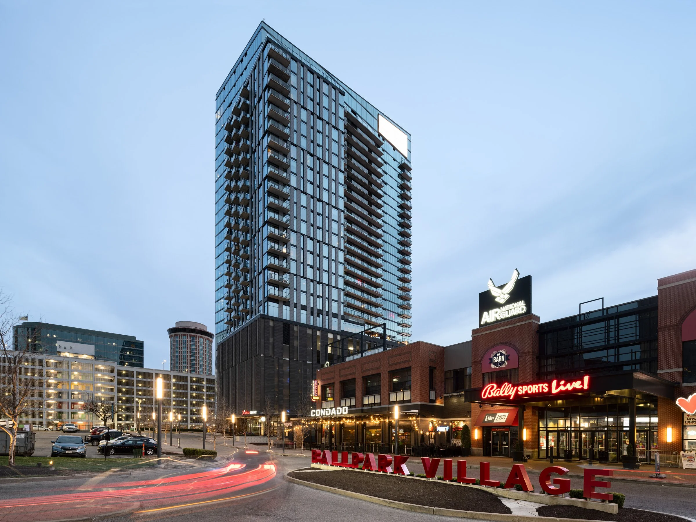 One Cardinal Way is the most recent skyscraper addition to downtown St. Louis. Overlooking Busch Stadium, this 29-story tower is the central feature of Ballpark Village, a redevelopment of surface parking lots into an upscale mixed-use district for young professionals and baseball enthusiasts. Designed by Hord Coplan Macht, the contemporary angular style deliberately contrasts with the stadium's nostalgic red brick, and is oriented to maximize views into the ballpark, as well as the Gateway Arch and Mississippi River. This visual connection is reinforced by the eighth-floor amenity terrace, where an infinity-edge pool and viewing platform are precisely positioned for game-day vistas, while ground-floor retail addresses both game-day pedestrian activity and residential needs.
