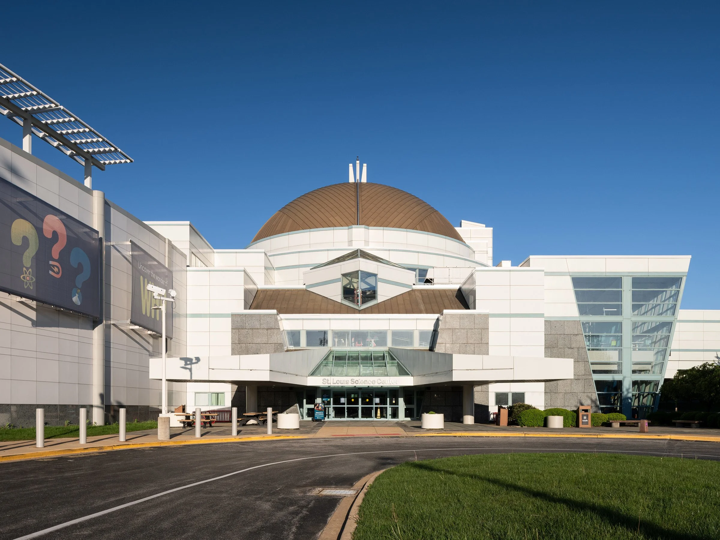 The main building of the St. Louis Science Center is a prominent, late example of Postmodern architecture, one of relatively few in the city. Clad in sleek white metal panels and concrete veneer with teal accents, and featuring a matte stainless steel dome, its futuristic, space-age aesthetic was intended at the time as a vision for a 21st-century museum. The building is composed of interconnected, flat-roofed rectangular volumes of varying heights. A large pyramidal skylight breaks up the flat rooflines and marks the central atrium. Twin canopies extend outward to form the entry portico. A distinctive pedestrian bridge resembling a jetway connects across Highway 40 to the stylistically contrasting McDonnell Planetarium. Designed by museum specialist E. Verner Johnson, this highly visible monument to the spirit of discovery remains a well-attended regional landmark.