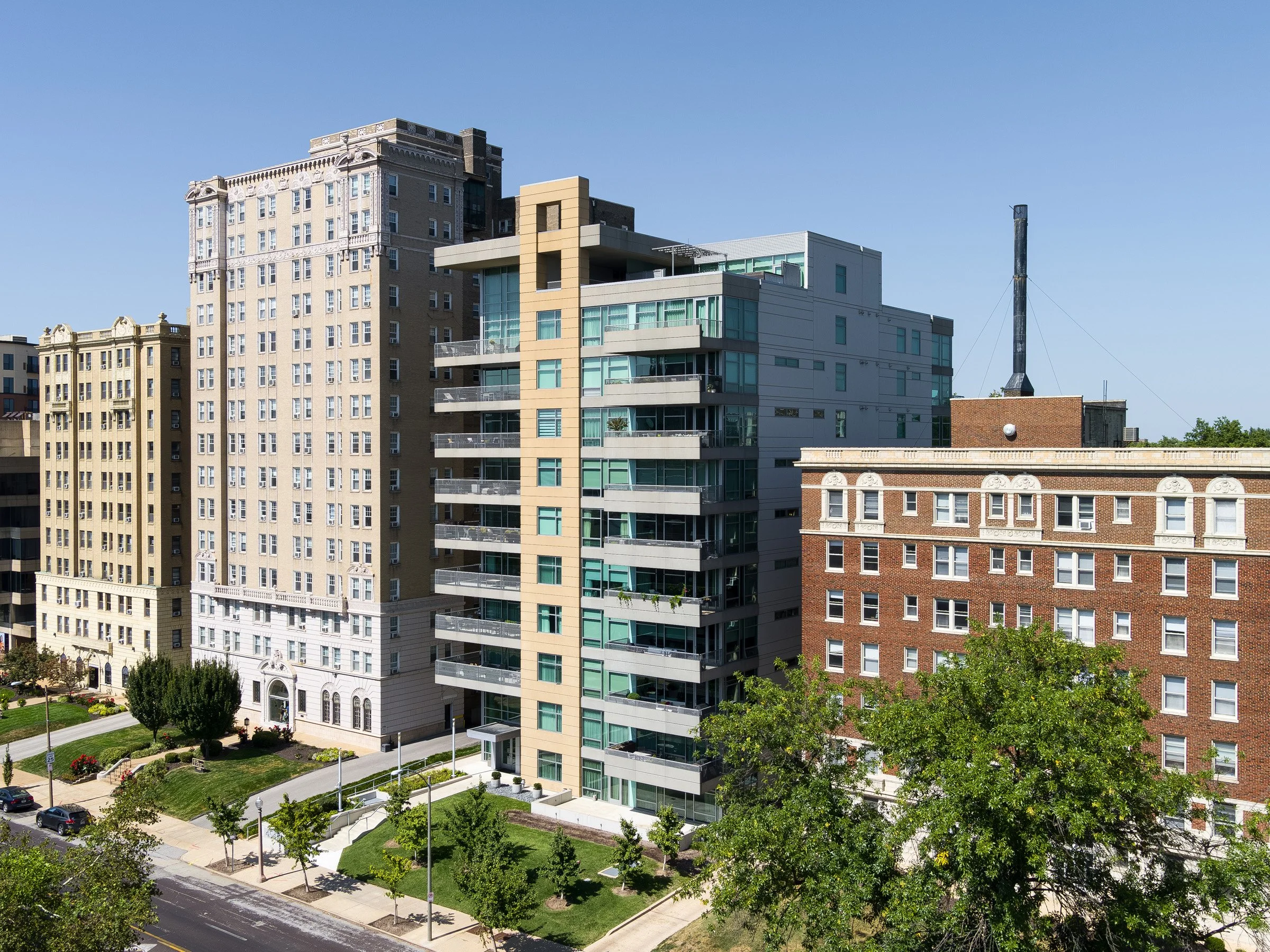 This residential tower at 4545 Lindell Boulevard is an example of the sleek, rectilinear modernism that returned to fashion in the mid-2000s, a style infrequently seen on this scale in the city. One of the last projects by Louis Saur, the building was intended to stand in stark material and formal contrast to the staid 1920s apartment towers surrounding its narrow site. A precast concrete structure with floor-to-ceiling walls of tinted, insulated glass and seamless, 90-degree floating corners lends to an aesthetic of lightness and transparency. Large private terraces extending beyond the envelope deliver on the marketing promise of "penthouse living on every floor.” Furthering themes of luxury and privacy, there are no shared corridors inside. Elevators open directly into private foyers in each of the thirty four units.